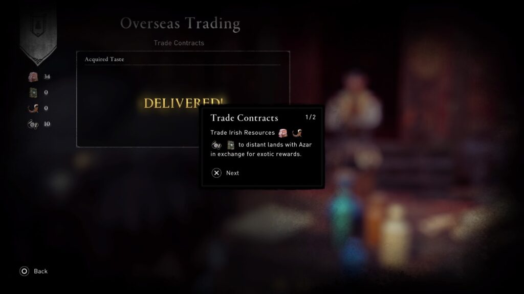 Otra mecánica nueva que fue agregada con este DLC, es el del comercio internacional, que en el juego se justifica como una forma de posicionar a Dublín como un importante centro comercial para Irlanda. Para ello, Azar cuenta con diversos pedidos por entregar provenientes de distintos países de la época, y nuestra misión es conseguir esos bienes para entregárselos.