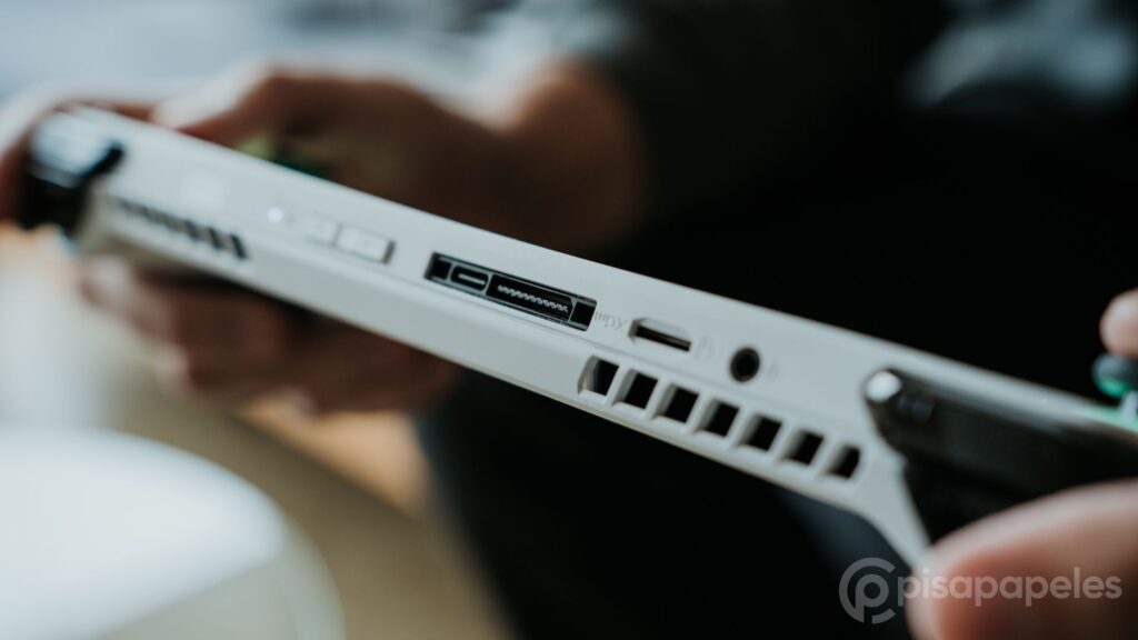 De izquierda a derecha nos encontramos con el conector de 3,5 mm para audífonos y micrófono, junto al puerto para MicroSD, con el que podrás expandir los 512GB que trae integrada la consola.