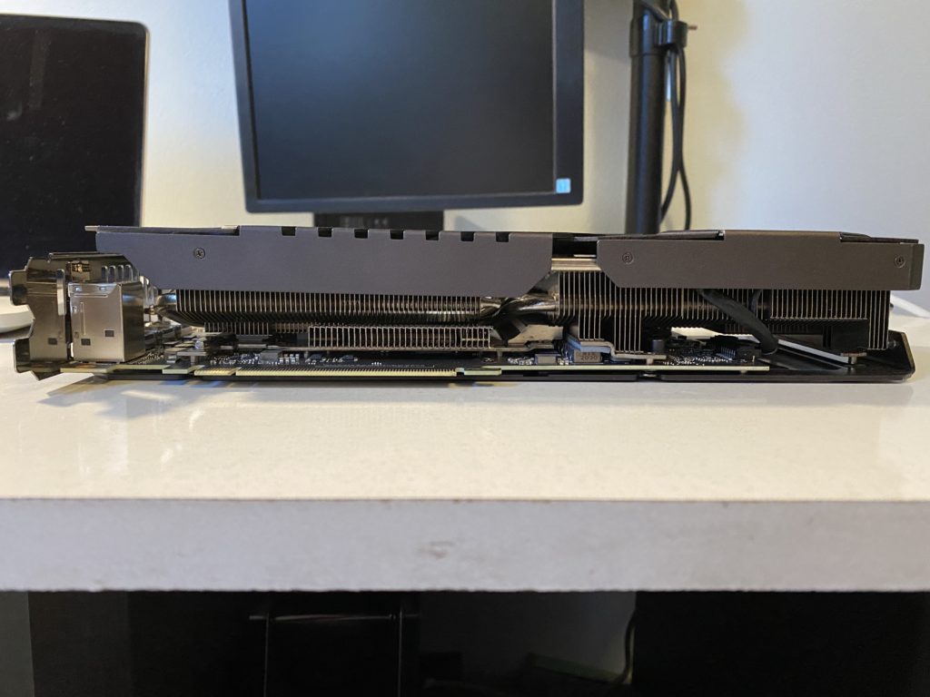 Viendo el lateral podemos darnos cuenta lo gruesa que es la solución termal de la nueva serie RTX 30. Utilizando casi 3 slots, es la tarjeta gráfica más gruesa que existe en el mercado. Esto tiene sus ventajas y desventajas. La ventaja no se ve a simple vista, y la mencionaremos más adelante. La desventaja es que sí o sí necesitas un soporte para evitar dañar el puerto PCI-E. El peso de la tarjeta gráfica es tanto que se puede ver a simple vista la inclinación de toda la placa, lo cual no es bueno.