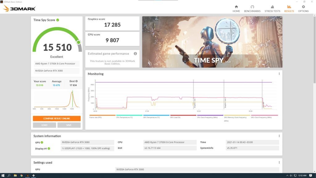 Pasando a datos más duros, obtuvimos 17.285 puntos en Time Spy, lo cual lo sitúa por sobre el resto de las tarjetas gráficas del mercado a excepción de la RTX 3090, la cual todavía está por salir. Nuevamente, la temperatura nunca superó los 67ºC, llegando a pequeños peaks de 68ºC.