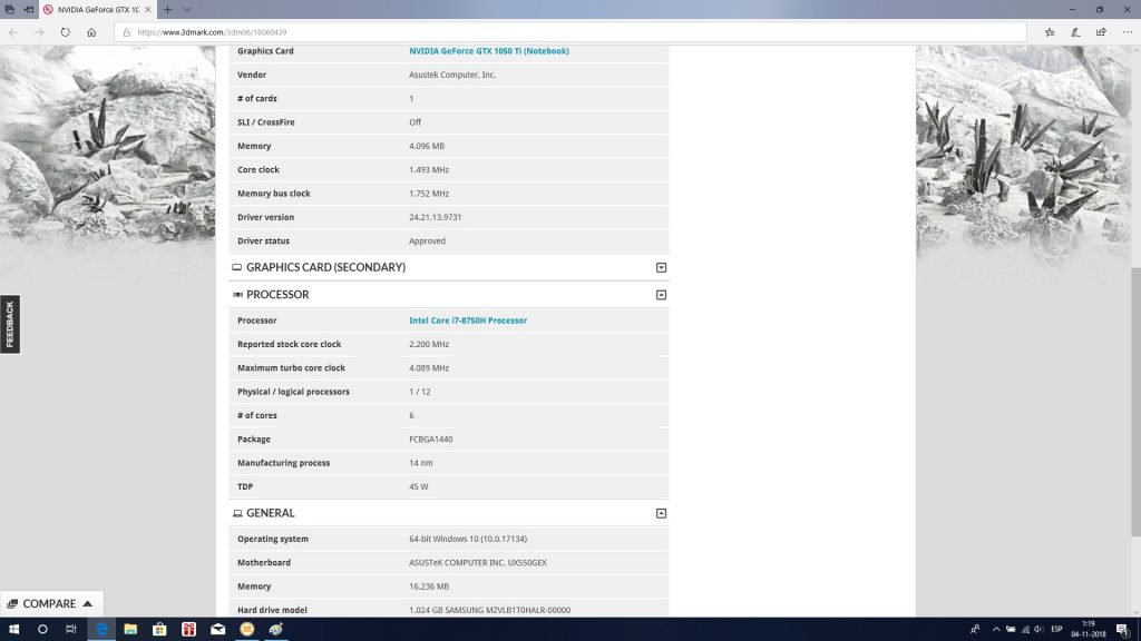 Finalmente, la unidad de gráficos es uno de los factores que también consideran bastante las personas a la hora de adquirir un notebook. El ASUS ZenBook Pro 15 carga dos unidades gráficas, la primera es una Intel UHD 630 (integrada), y la segunda es una NVIDIA GTX 1050 Ti de 4GB, la cual pertenece a la gama media de las tarjetas gráficas de NVIDIA.