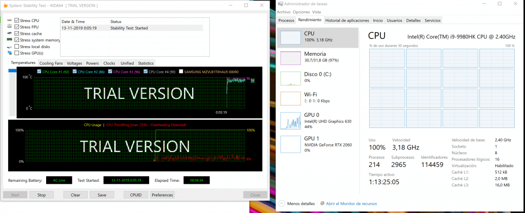 Por el lado del hardware, tenemos un problema un poco más grave. A pesar de tener dos salidas de aire lateral y hacer uso del ángulo que genera la pantalla para obtener aire frío por debajo, en pruebas sintéticas de carga el ZenBook Pro Duo automáticamente se ve obligado aa bajar su frecuencia debido a sobrecalentamiento. Mientras la frecuencia base del procesador es 2,8 GHz. con una frecuencia turbo de hasta 5GHz. en realidad, luego de algunos segundos, el procesador se mantuvo estable cerca de los 3,2GHz., frecuencia un poco superior a la base y muy por debajo de la turbo. Apagando el ScreenPad+, obtuvimos los mismos resultados.