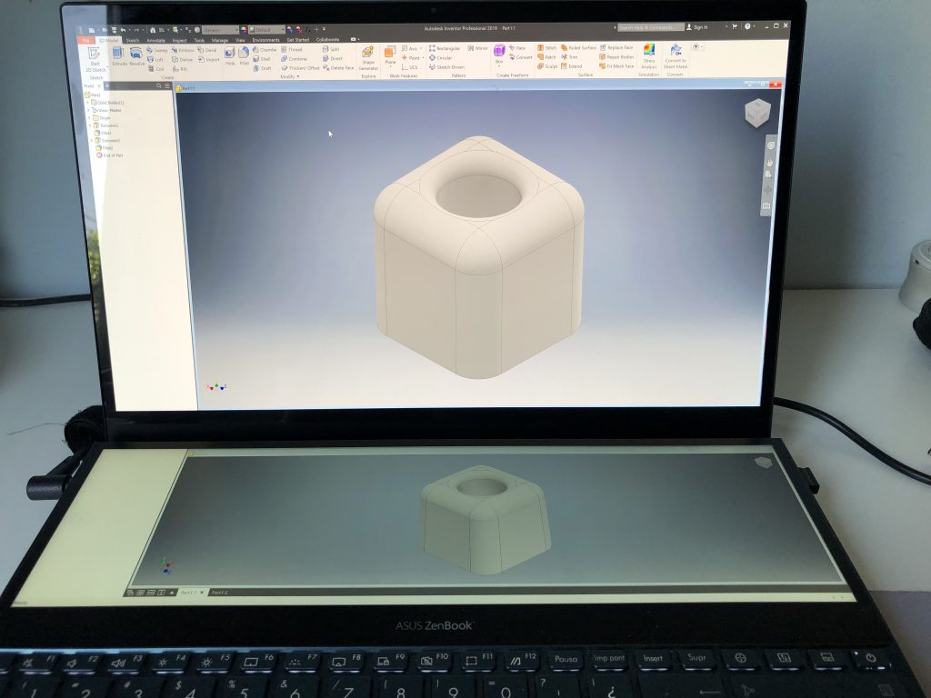 Haciendo uso de la pantalla extendida ScreenPad+ podemos, por ejemplo, tener dos vistas simultáneas en Inventor, o activar la consola en Chrome sin perder espacio de visualización. Podemos también extender la ventana utilizando ambas pantallas. Esta pantalla secundaria también es ideal para dibujar, debido a que tiene una textura más mate, rugosa, simulando la de un papel.