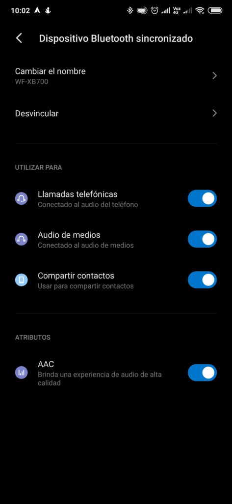 Mi smartphone también me daba la posibilidad de usar el códec de transmisión AAC, aunque por defecto el sistema operativo usa el códec SBC. Los audífonos usan Bluetooth 5.0 y NO cuentan con NFC.