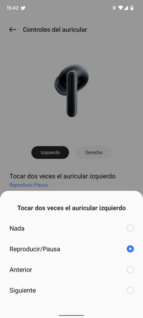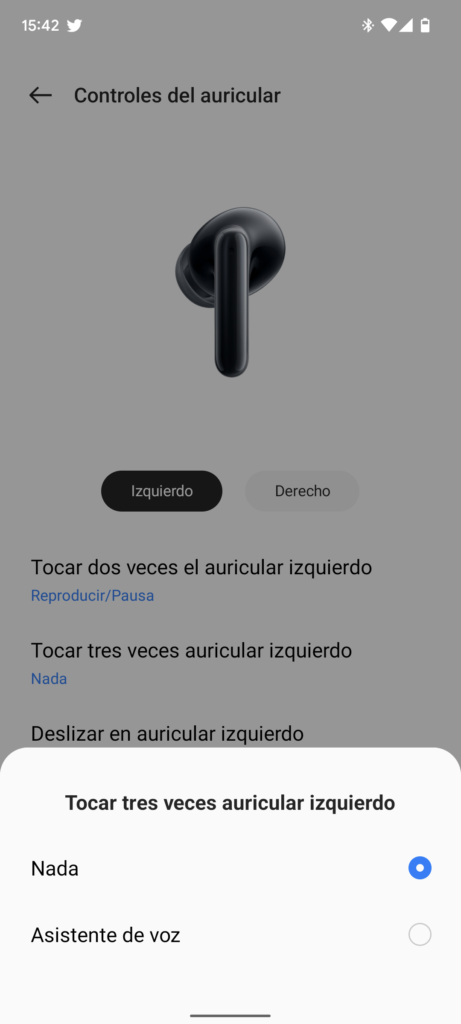 Luego tenemos la opción de modificar los controles táctiles de los Enco X. La buena noticia es que podemos modificar el izquierdo y el derecho de forma separada, la mala es que las opciones están limitadas sin ningún sentido, y de forma predeterminada, hay dos importantísimas que no están habilitadas: pausar y activar el asistente. Si, no se puede pausar la música por defecto.