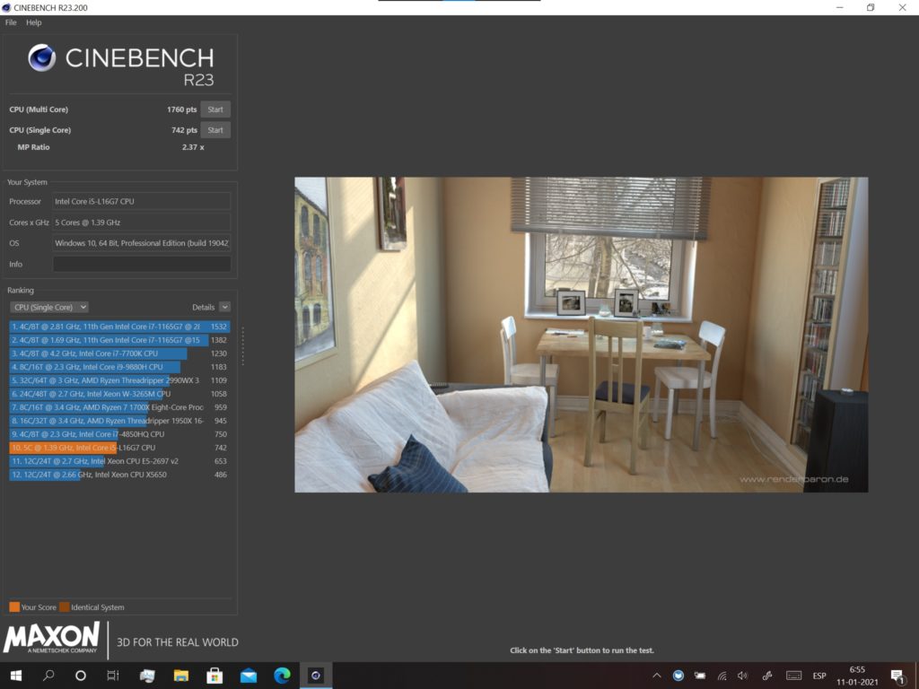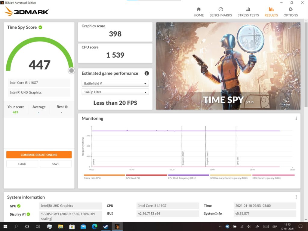 Si nos vamos al detalle del procesador, el i5 es un Lakefield de 5 núcleos físicos y 5 virtuales con tecnología big.LITTLE. Respecto al reloj, su frecuencia parte en los 1.4 GHz con un máximo de 3.0 GHz los cuales están acompañados de 4 MB de caché L3. Acá debo reconocer algo, en un principio el procesador presentaba algunos cuelgues o aumentos excesivos del uso de la CPU, lo cual afectaba el rendimiento en general. Sin embargo, realicé una actualización de la BIOS y el rendimiento mejoró notablemente, mucho más estable y sin los problemas antes mencionados. Dicho esto, el procesador es perfecto para realizar trabajos de oficina, uso académico o para el hogar.