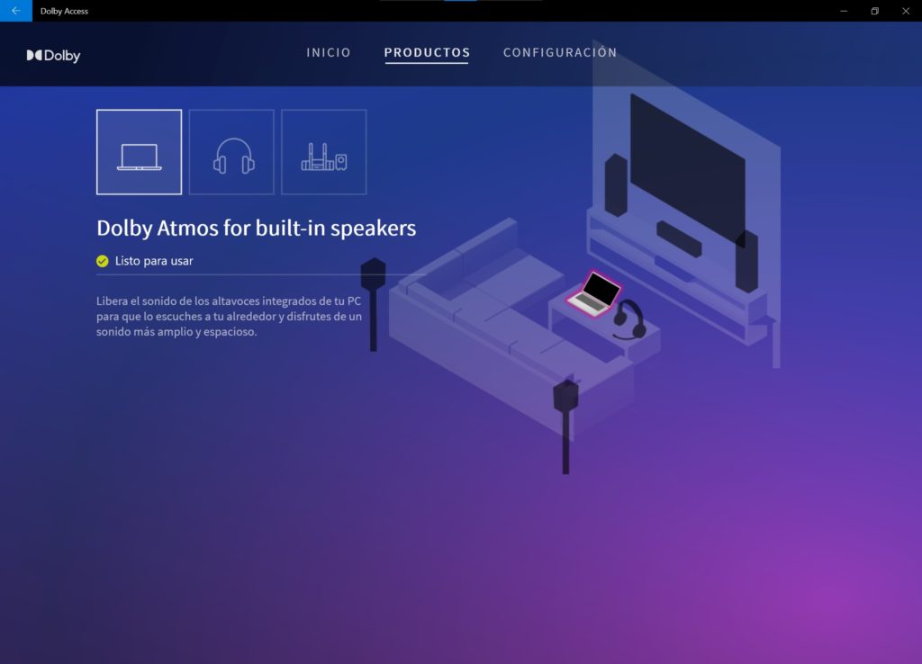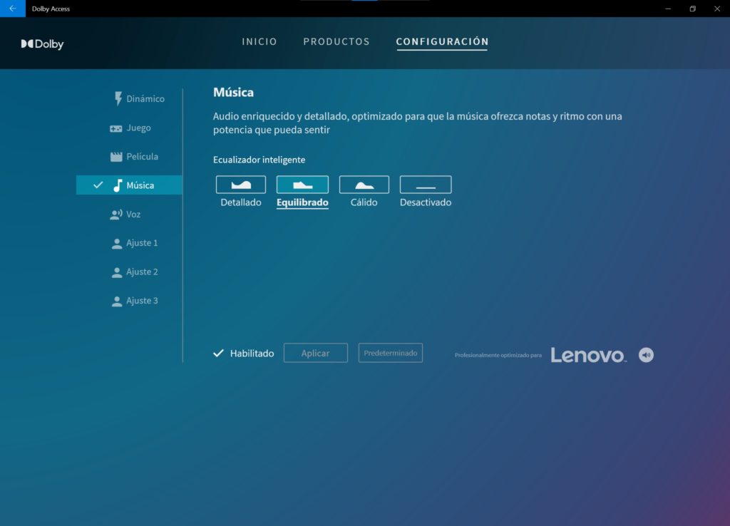 De igual forma, puedes cambiar los parámetros de sonido por medio del ecualizador de Dolby Audio con distintos perfiles predeterminados como el modo película, juegos, música, dinámico, voz o personalizado.
