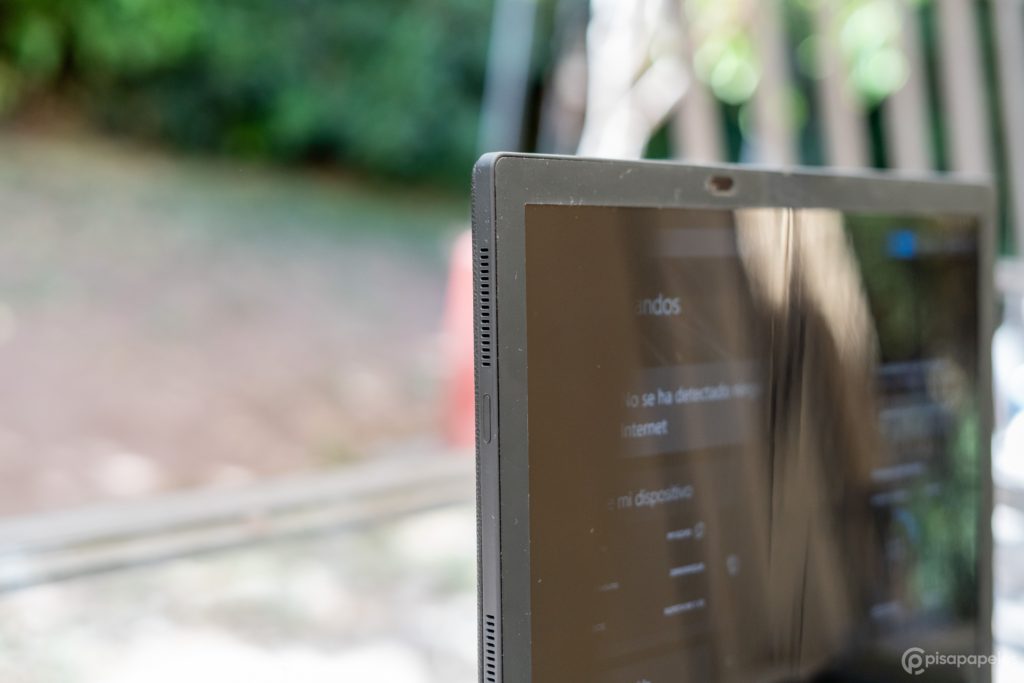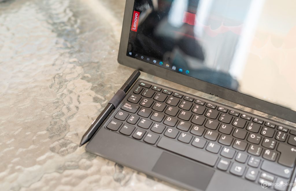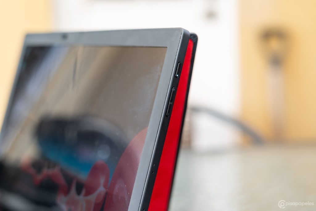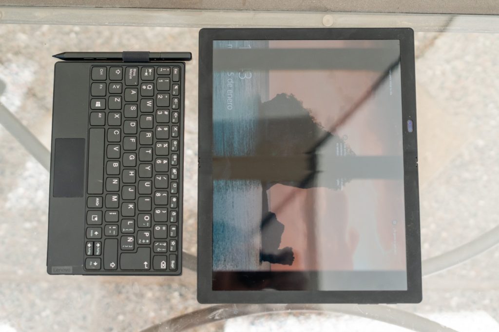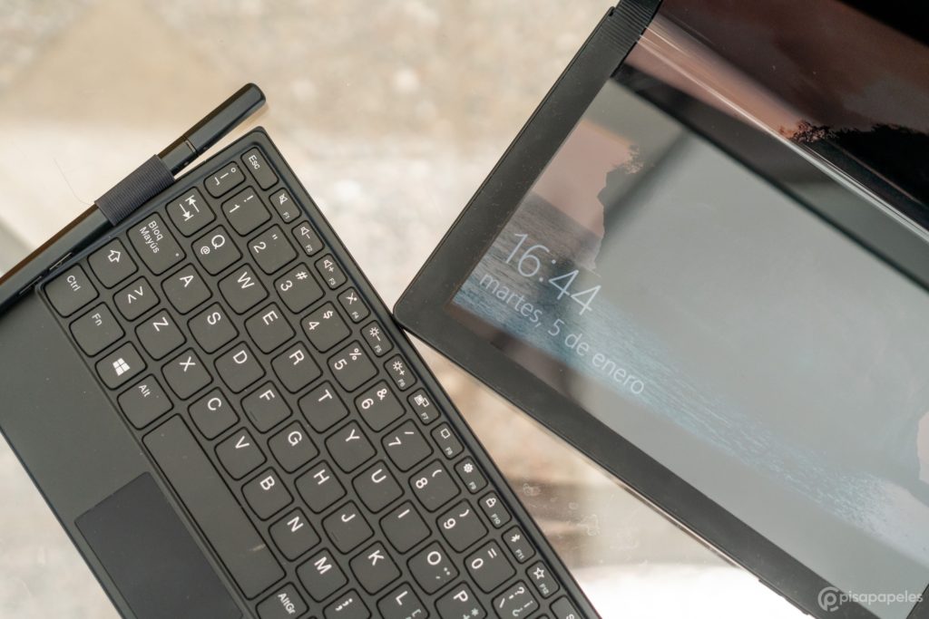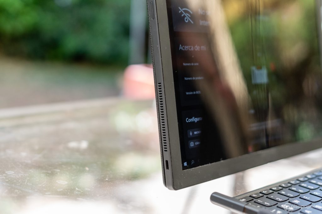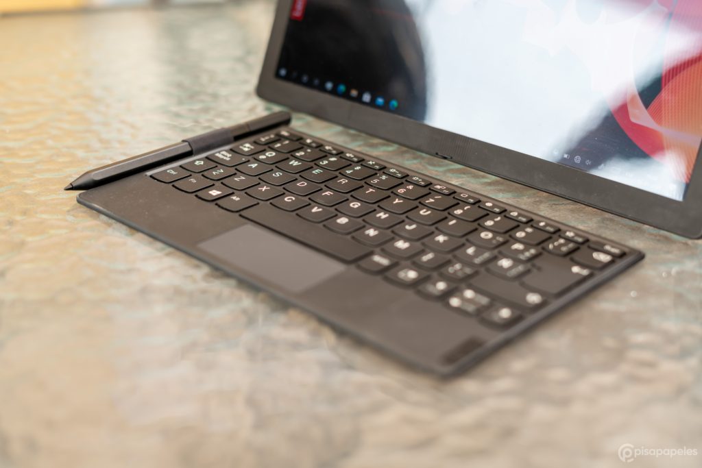 En esta sección del diseño, suelo hablar del teclado de los equipos, pero como estamos frente a un dispositivo 100% táctil, el teclado se presenta en pantalla de forma virtual. Sin embargo, Lenovo incluye en la caja un teclado físico inalámbrico con español latino, el cual resulta ser muy delgado y cómodo a la hora de digitar texto. Lamentablemente no posee retroiluminación por lo que habrá problemas para escribir en ausencia completa de luz. Y su trackpad es demasiado pequeño para ser operado fácilmente.