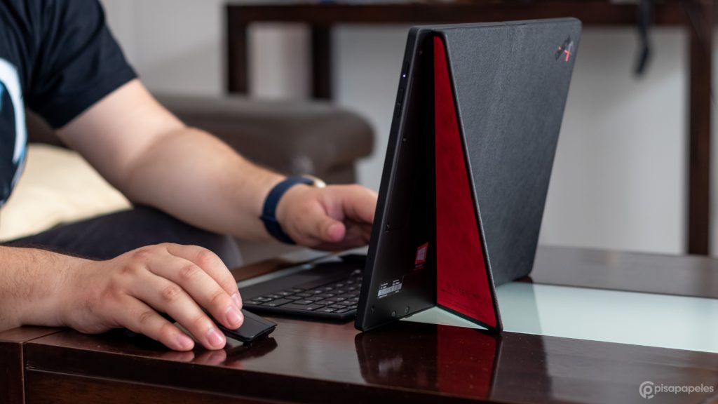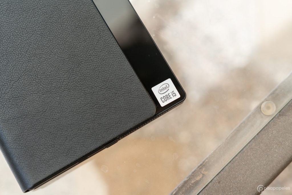 El equipo incluye una cubierta de cuero sintético, un mínimo esperable por su precio que contaré al final de la revisión. Con esto no es necesario recurrir a fundas externas para proteger su estructura y, al ser plegable con el panel hacia el interior, la pantalla queda protegida frente a daños en caso de una caída o golpe involuntario. Es más, si usamos el portátil en un escritorio, esta funda también puede ser usada como un soporte para mantener el equipo en posición vertical.