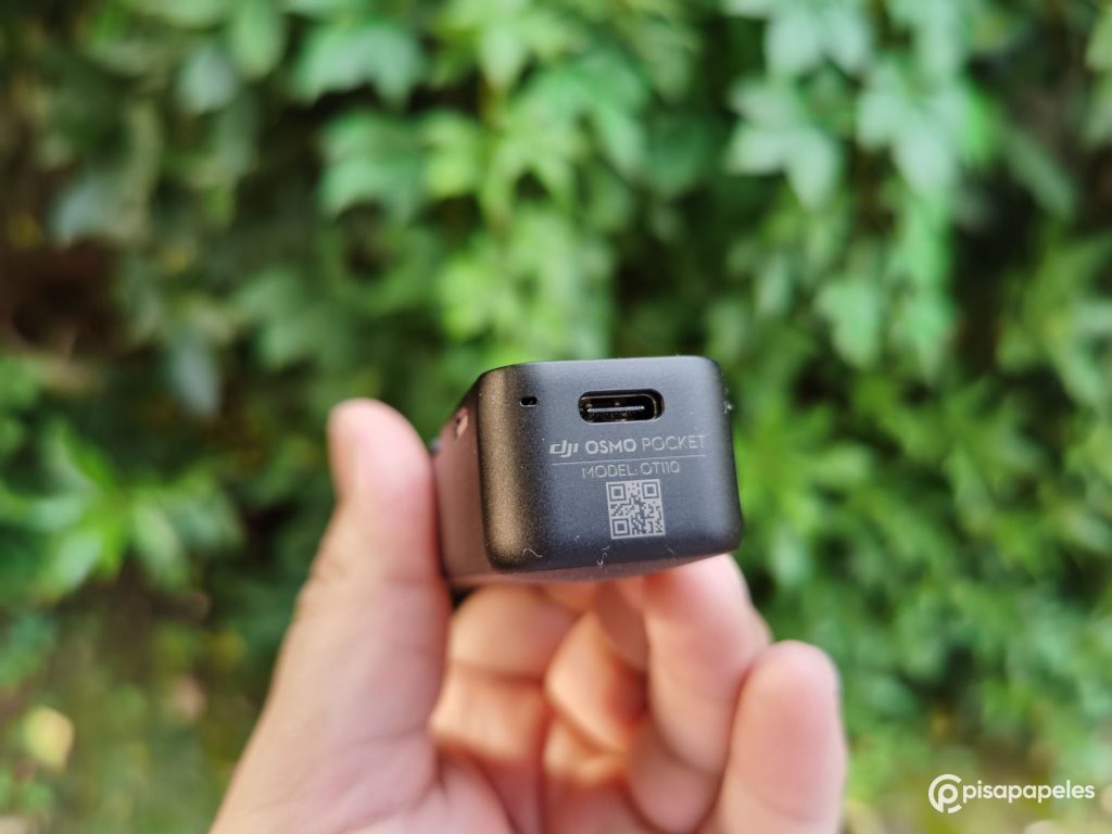 Por el lado inferior tenemos el puerto de entrada USB Tipo-C para poder cargar la batería de nuestro Osmo Pocket, y lo mejor de todo es que al ser USB Tipo-C, vamos a poder usar el cargador de nuestro Smartphone si así lo deseamos. Acá también está el micrófono principal.