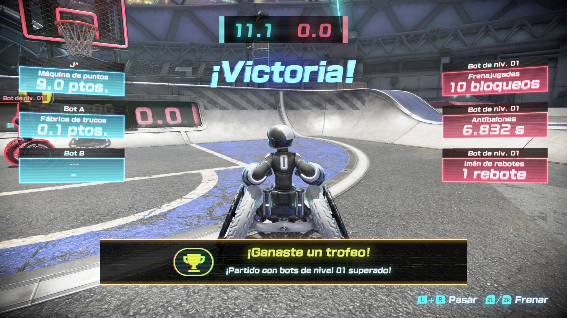 Aparte de eso, el sistema de movimientos está muy bien logrado. Puedes aumentar fácilmente la velocidad con movimientos largos y relajados, y subir por los medios tubos de la cancha para hacer un mate o bloquear un tiro. Los botones ZL y ZR te permiten frenar, y también puedes usarlos para hacer un bunny hop, dándote un poco de elevación extra al bloquear o disparar.