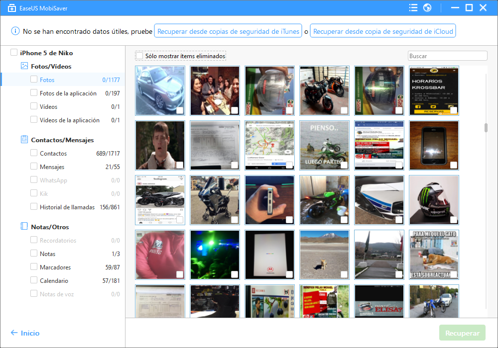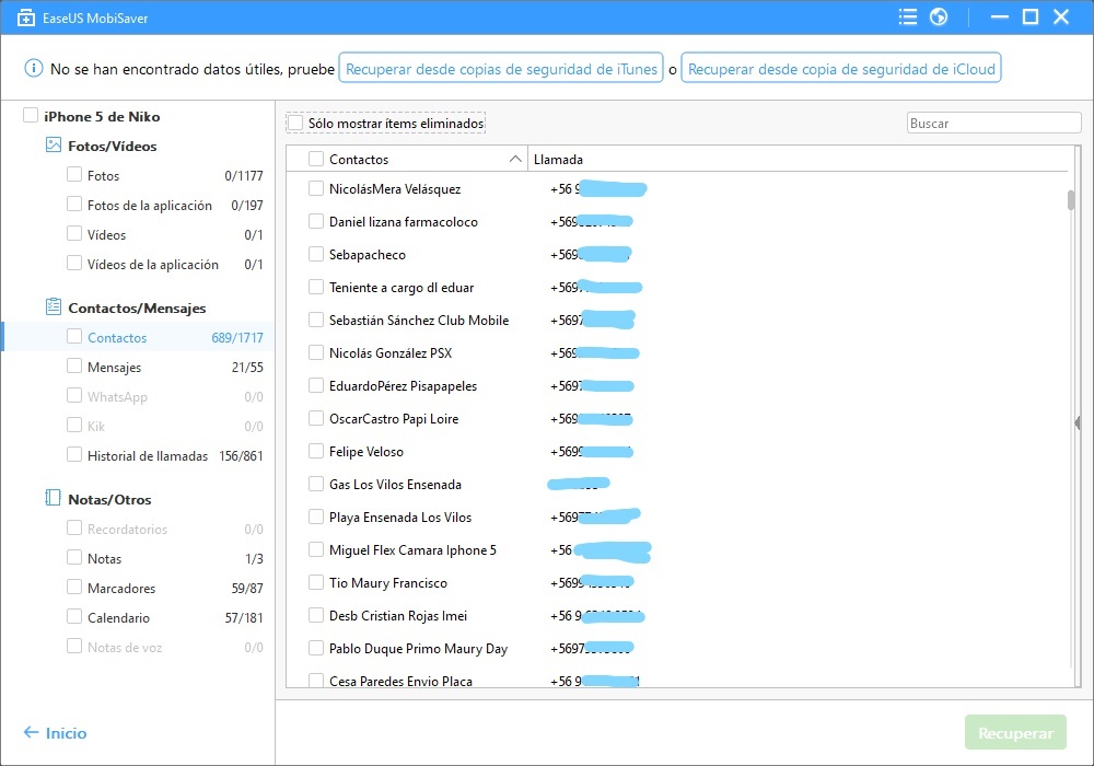 Una vez conectado el iPhone, nos pusimos a escanear, para ver qué lograba encontrar. Luego de unos 6 minutos, empezaron a aparecer los contenidos del teléfono. Fotos, mensajes, contactos, recordatorios, etc. Seleccionamos algunos y pudimos guardarlos sin problemas. Algunos detalles menores es que en algunos casos aparecían contactos con texto ilegible, y el contenido tanto en las fotos como en los mensajes no estaba en orden. Sí, puedes rescatar el contenido. Pero no en el orden original.