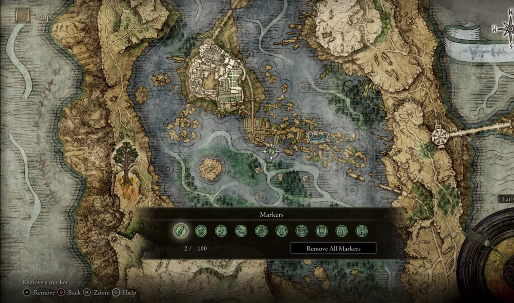 Para ir guiándote, en el mapa podrás colocar marcadores que te ayudarán a volver a un lugar en el que hayas encontrado algo que, de momento no puedes utilizar, acceder, derrotar o en el que el juego simplemente te haya superado. Estos marcadores son esenciales porque, a diferencia de juegos de Sony o Ubisoft, en los que tenemos un menú de misiones y miles de marcadores automáticos por explorar en el mapa, Elden Ring no los coloca por ti.