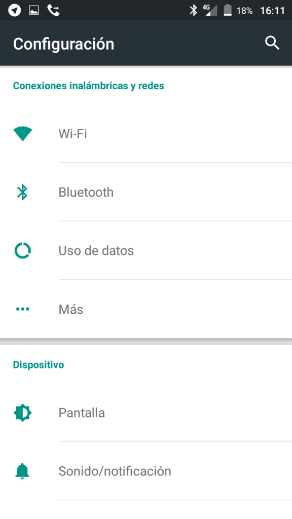Entrando de lleno al menú de configuración, acá encontramos el mismo menú original de Android en donde podremos ajustar la pantalla, el audio, el tema de la seguridad, aplicaciones, memoria… etc, además de mostrarte cómo es la barra de notificaciones.