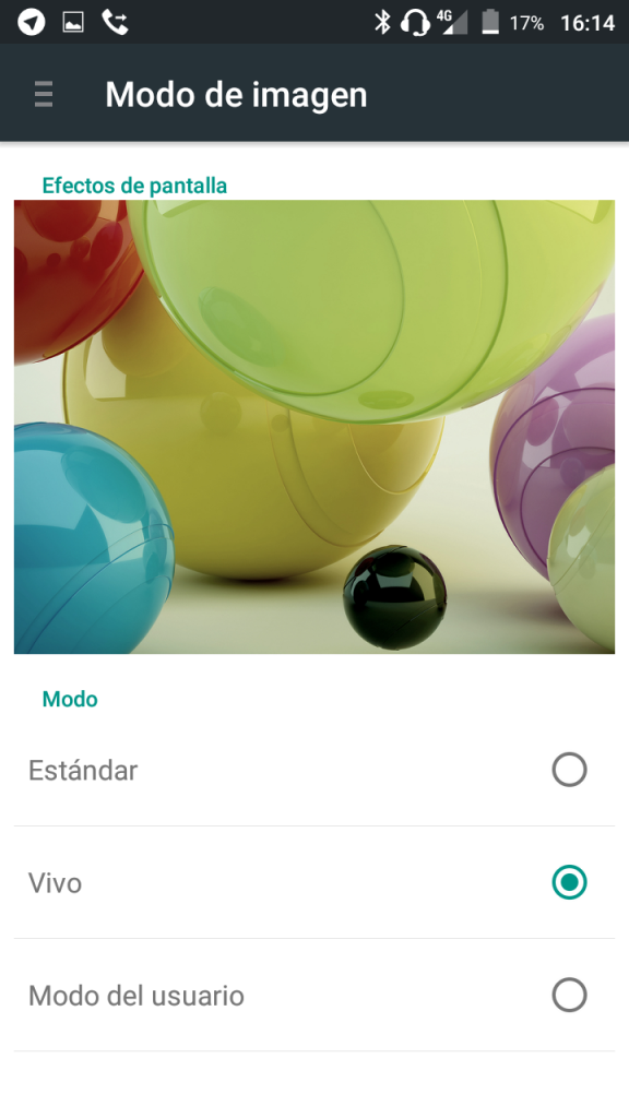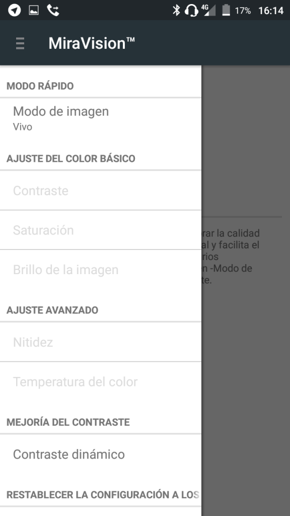 Para mejorar la calidad de imagen, la pantalla nos ofrece la tecnología MiraVision — la misma que podemos ver en el OnePlus 3 — con ella podemos aumentar la intensidad de los colores o controlar manualmente el contraste, saturación, brillo, nitidez y la temperatura del color, incluso podemos activar un contraste dinámico.