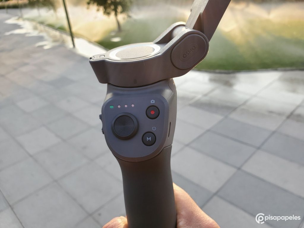 Lo primero que veremos será su joystick que nos permitirá controlar el Osmo, al lado también está la tecla multifunción que servirá para encender, apagar, suspender la estabilización o reanudar, cambiar al modo foto o video, y elegir entre dejar horizontal o vertical el smartphone. Cada función irá variando de acuerdo con la intensidad y veces que se toca la tecla.