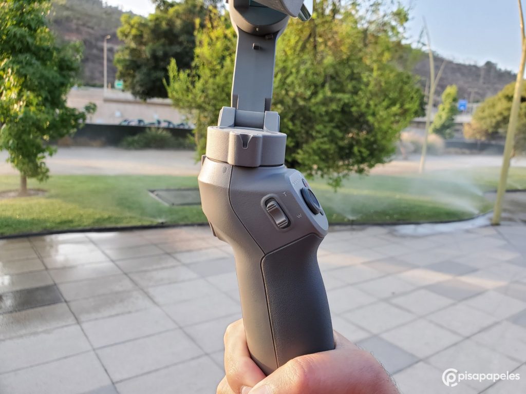 Al lado tenemos la tecla para tomar una foto o, iniciar o detener la grabación de video. Por el lado izquierdo tenemos la tecla deslizante que nos permitirá controlar el zoom digital, mientras que por el lado trasero tenemos el “disparador” que permitirá volver al Osmo a la posición original, mantenerlo en una sola posición o activar el seguimiento de objetos inteligente.