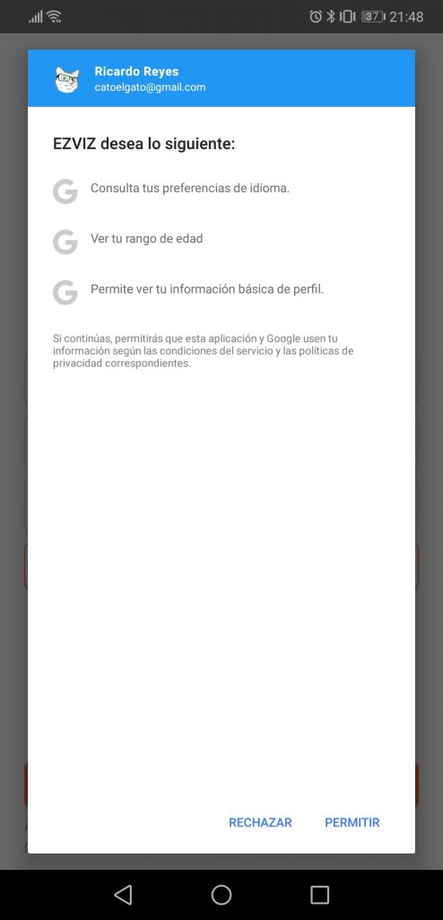 Sólo con buscar EZVIZ nos saldrá la aplicación en la tienda Google Play, pide permisos inherentes a su funcionamiento tales como, Identidad del dispositivo, acceso al almacenamiento acceso, a realizar llamadas, SMS, información de la red Wifi, acceso a micrófonos, parlantes, contactos y un largo etc.