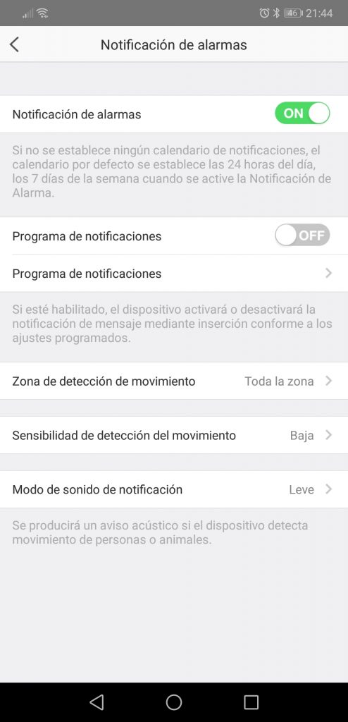 NOTIFICACIÓN DE ALARMAS: Esta sección encuentro que es una de las más desarrolladas en el software de la cámara, aquí es posible activar alarmas por movimiento, por lapsos de horas, días y sectores de lo que ve la cámara, además es posible ajustar la sensibilidad de la misma.