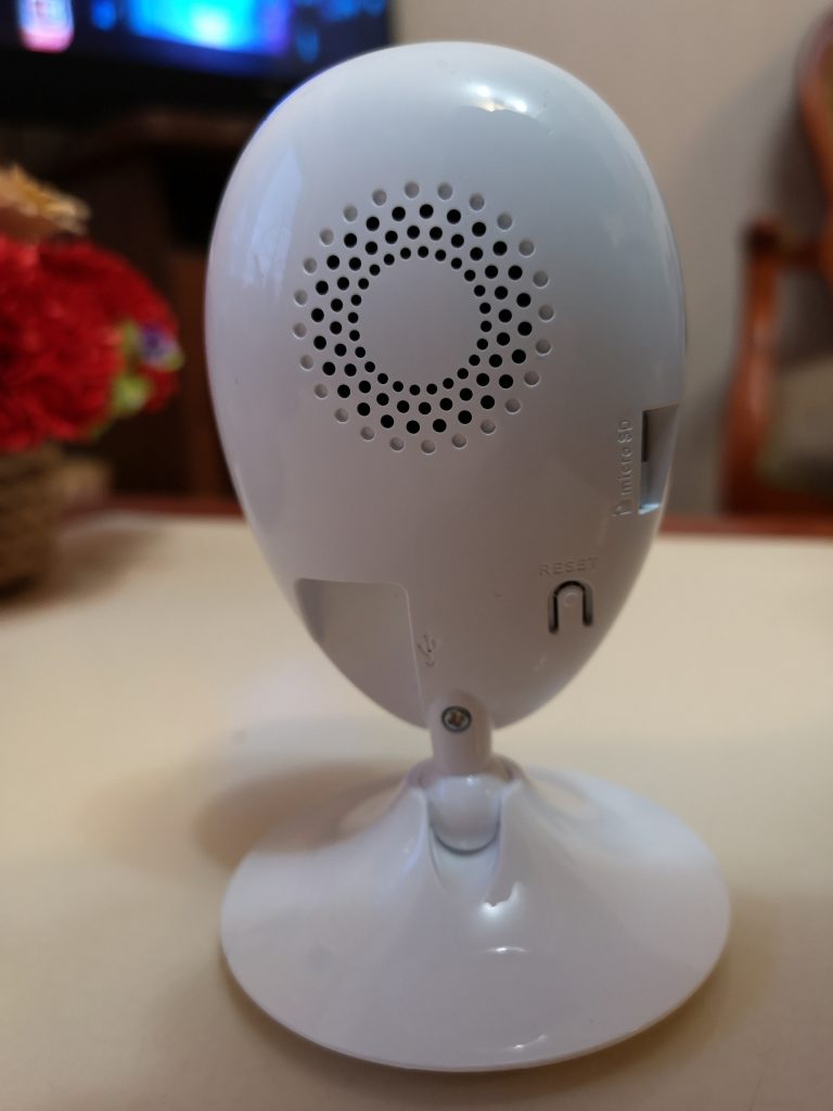Por la parte trasera de la cámara, se destaca por sobre todo el parlante incorporado el cual suena bastante fuerte, claro que no se le puede pedir una tremenda calidad, pero para la acción de intercomunicación funciona perfectamente, bajo este se encuentra el acceso al puerto de alimentación de energía, junto a este el botón “Reset” y finalmente la ranura para MicroSD.