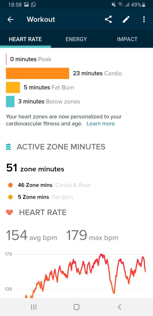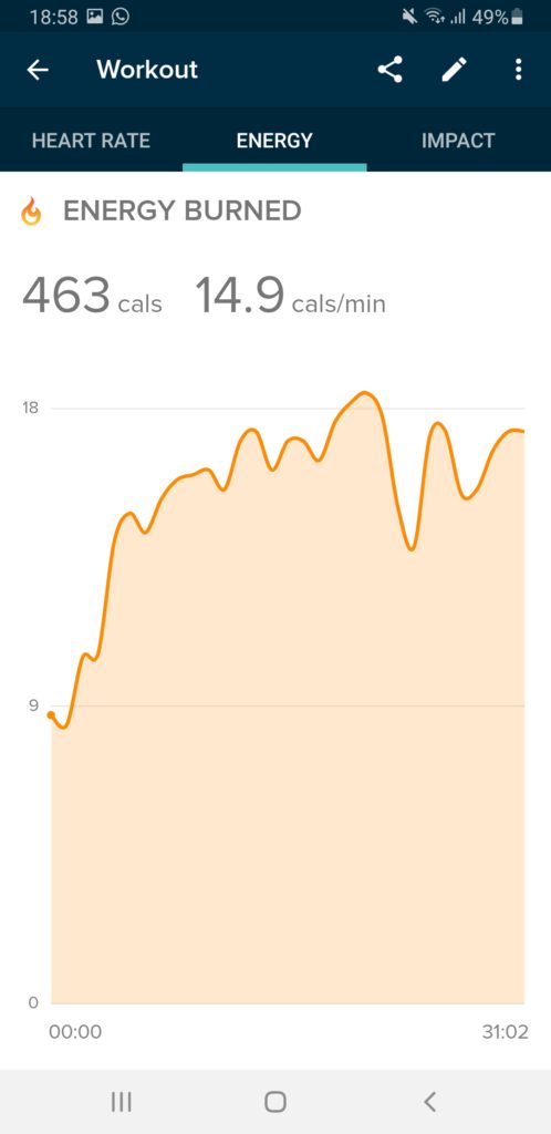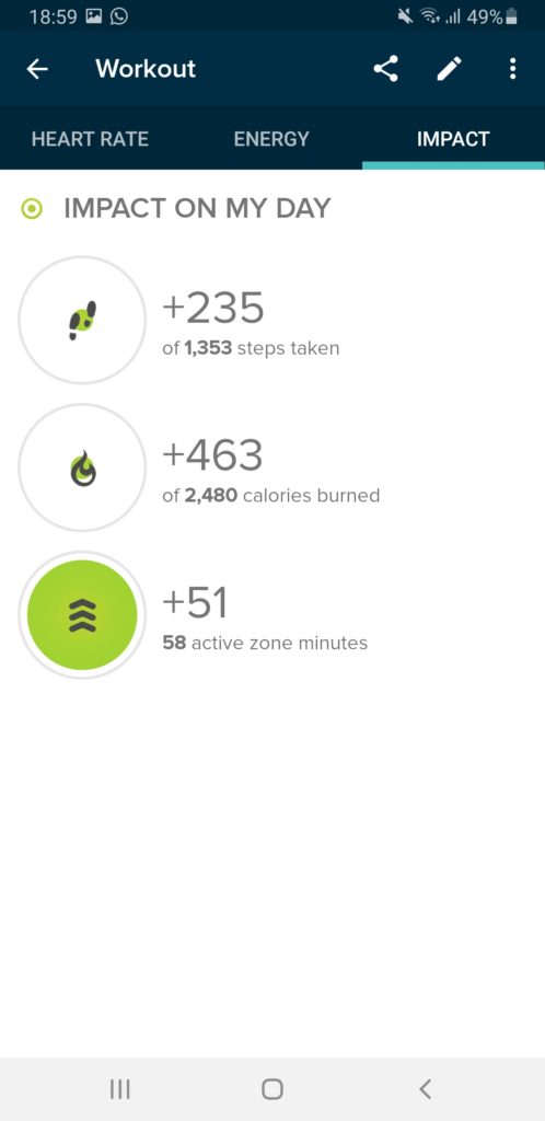 Dependiendo del ejercicio, la banda será capaz de medir distintos atributos. Principalmente yo lo probé con una rutina de ejercicios, y te entrega las calorías quemadas, tu frecuencia cardiaca a lo largo de toda la rutina y también la cantidad de tiempo en que se estuvo en zonas de cardio o quemagrasa.