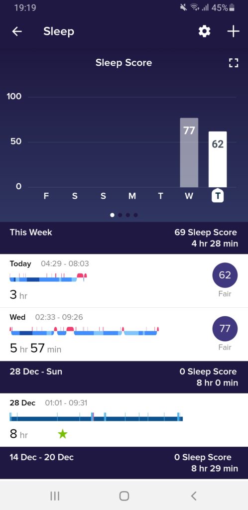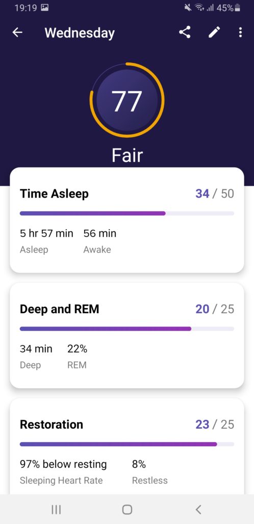Por supuesto que también es capaz de monitorear nuestro sueño de una manera bastante completa, entregándonos las distintas fases del mismo, el tiempo durmiendo, y un puntaje que nos indica la calidad general de nuestro sueño.