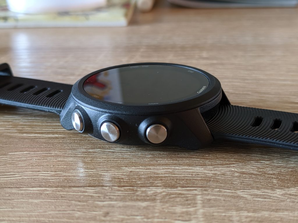 En su cuerpo de 42mm contamos con 5 botones, 3 en el lado izquierdo y 2 en el derecho, que sirven para navegar a través de la interfaz y encender la luz de la pantalla. Los botones están bien diseñados y cuentan con un buen feedback al momento de presionarlos, aunque cabe destacar que hay que hacer un pequeño esfuerzo para presionarlos con facilidad, es decir, hay veces en las que debo agarrar el reloj para presionar los botones. El botón superior derecho cuenta con pequeños acentos de color rojo que le dan un poco más de protagonismo, ya que es el que inicia y termina una actividad, pero hubiese sido bueno incorporar alguna textura distinta.