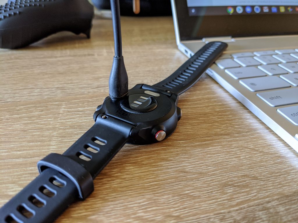 Punto aparte para el método de carga, que funciona como manguera para echar bencina, ya que es un pequeño cable que se inserta en la parte trasera del reloj, haciendo difícil las cosas para dejarlo en una superficie plana ya sea por la altura del lugar donde lo queramos dejar o por el pésimo método de conexión al reloj. Es como si estuviera pensado para cargarse exclusivamente a través de un computador.