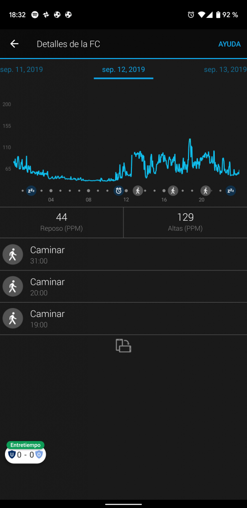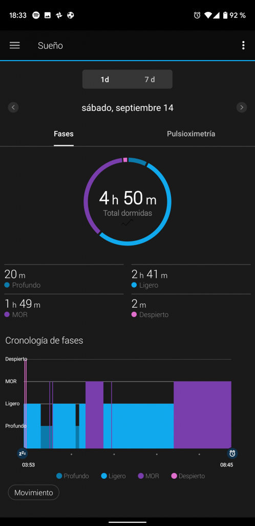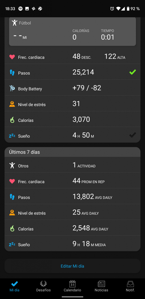 En la parte inferior tenemos 5 pestañas que nos llevarán a diferentes apartados. El primero y más importante es «Mi día», que nos permitirá llevar seguimiento en tiempo real de todo lo que el reloj es capaz de medir, ofreciéndonos distintos gráficos para estadísticas de sueño, calorías, frecuencia cardiaca, estrés e hidratación, entre otras, para lo que hemos realizado durante el día.