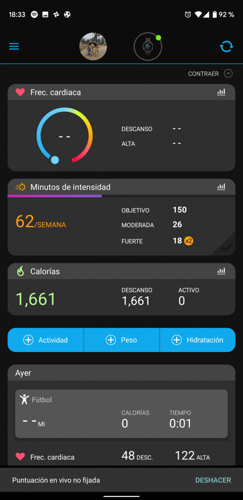 Si presionamos el botón superior derecho accederemos rápidamente al apartado para iniciar una actividad, que de forma predeterminada es «carrera» pero podemos determinar que sea cualquier otra, ya sea entrenamientos de fuerza, bici o incluso deportes como natación o fútbol.