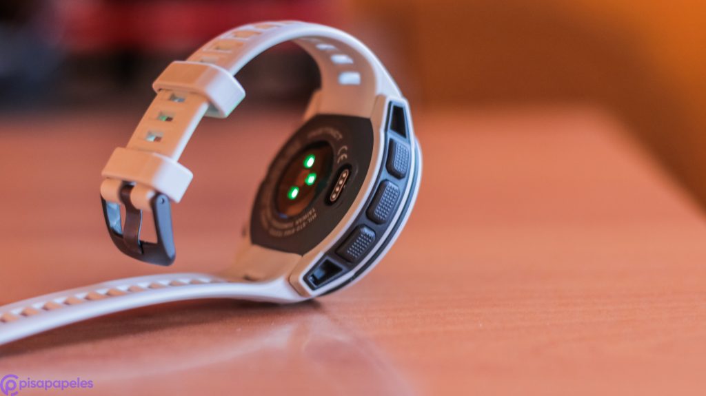 Por último, en la parte inferior nos encontramos con el sensor de ritmo cardíaco, así como también el puerto para poder conectarlo al cargador.