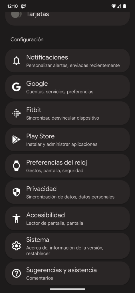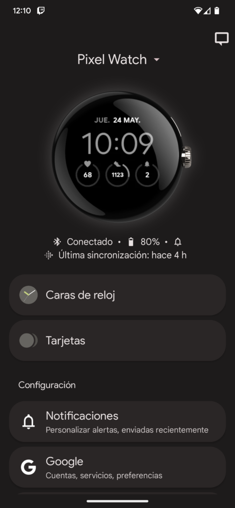 Pero lo primero es la configuración, que se realiza de forma medianamente automática gracias a Fast Pair, que te lleva a descargar la aplicación dedicada del Pixel Watch en la Play Store. Con esta app podemos modificar la configuración del reloj, personalizar el watchface o elegir las Tarjetas –Tiles en inglés– que nos ofrece Wear OS para acceder rápidamente a diferentes funciones de las apps.