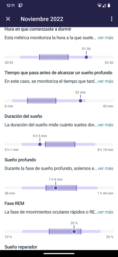 Uno de la datos que más me ha gustado es el perfil de sueño mensual, que nos ofrece gráficos comparativos del desvelo o del tiempo que demoras en alcanzar el sueño profundo, comparando tu sueño, con el ideal y el habitual. Una lata no poder seguir viendo estas estadísticas, porque yo nunca tan fanático de la salud como para pagar el precio mensual de 8 dólares. Google te da 6 meses gratis y ahí ves si sigues.