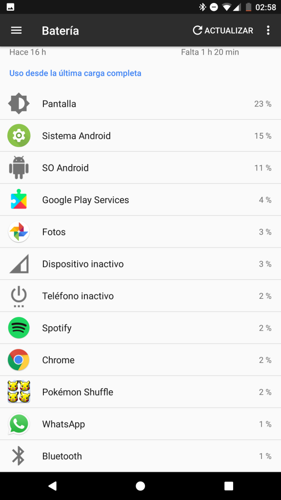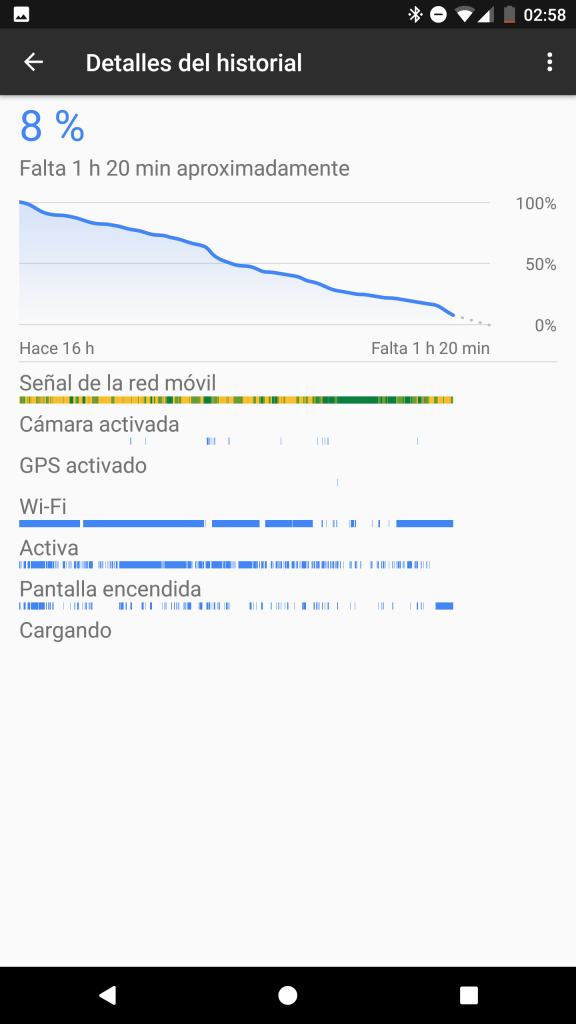 A continuación se detalla un día completo con el uso que le doy yo a un smartphone, es decir, muchas redes sociales, GPS y juegos ocasionales, y mucho uso de la cámara, estando siempre conectado a un reloj con Android Wear y un Chromebook.