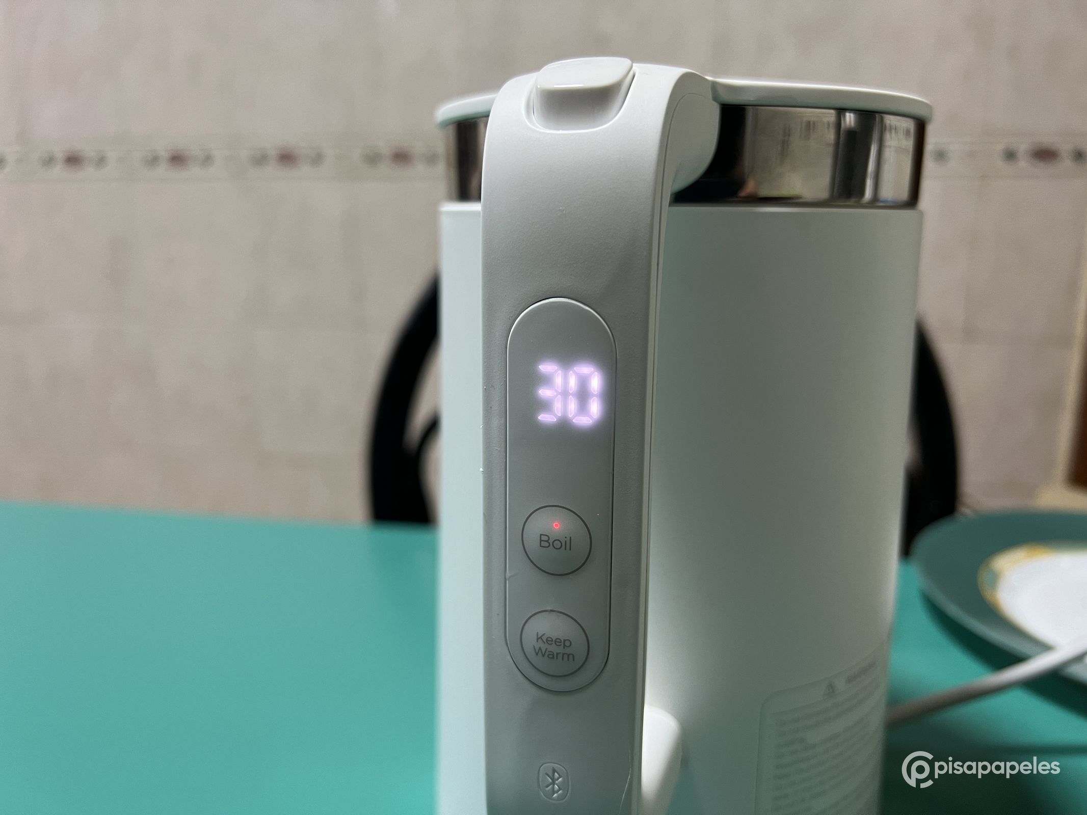 Volviendo al hervidor, específicamente al mango, vamos a encontrarnos con dos botones que nos permitirán activar el dispositivo y también elegir la temperatura deseada, la que se va mostrando en una pequeña pantalla con números blancos. Más arriba tenemos otro botón que nos permitirá abrir la tapa.