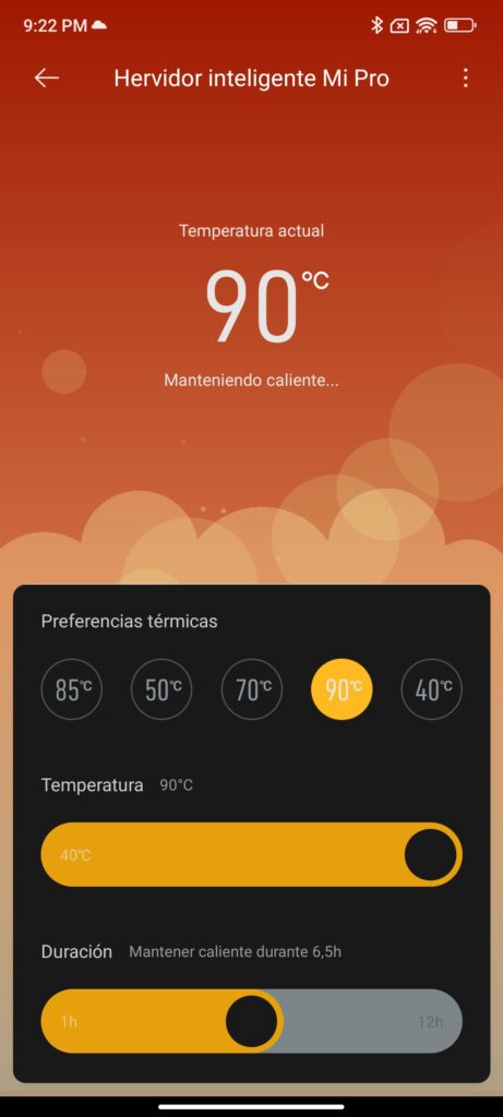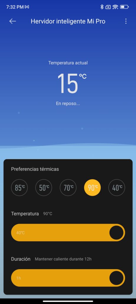 Una vez conectado el hervidor con nuestro móvil, vamos a poder saber a qué temperatura se encuentra el agua en el interior y el estado actual.