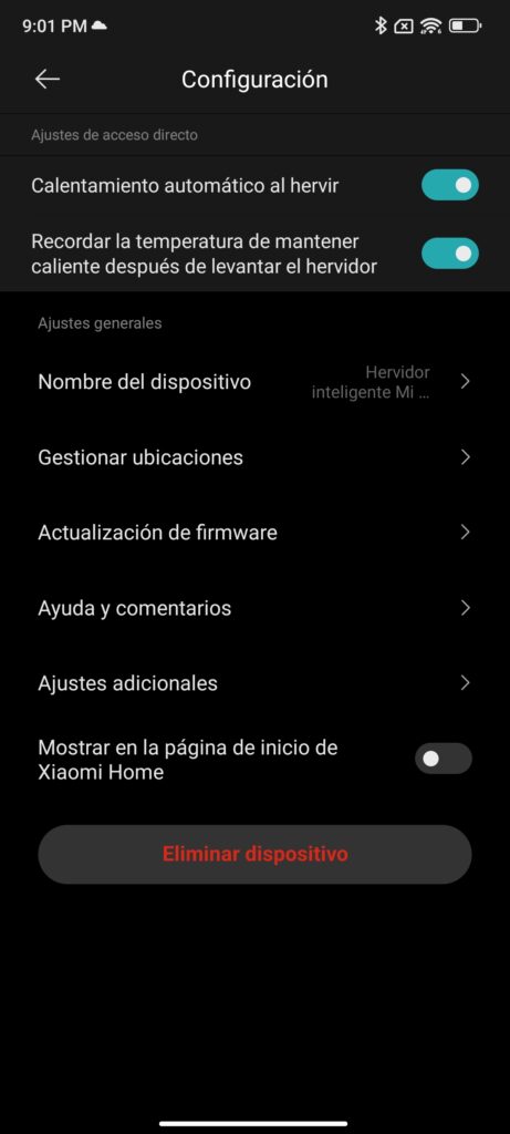 En el menú de configuración podremos activar dos opciones más. La primera se llama “Calentamiento automático al hervir”, y la segunda se llamada “Recordar la temperatura de mantener caliente después de levantar el hervidor”. Además, podemos cambiar el nombre del dispositivo y tener la posibilidad de actualizar su firmware.