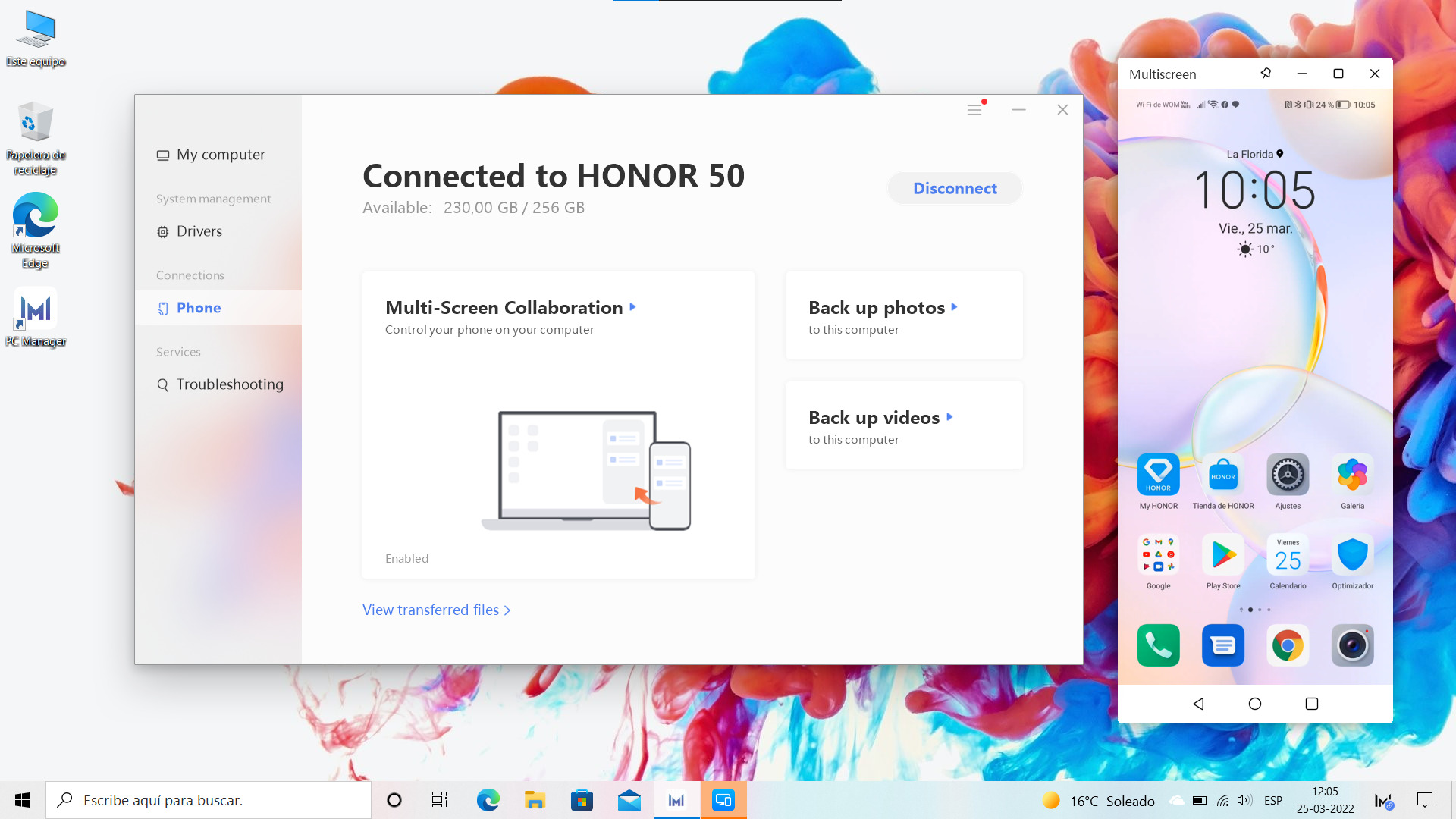 Pero lejos lo más útil que me ha resultado de esta función es la posibilidad de transferir archivos entre ambos equipos de manera inalámbrica y con solo arrastrarlo. Por ejemplo, si quieres copiar un video del móvil al computador, solo debes abrir el administrador de archivos en el Honor 50 desde un MagicBook, buscar el archivo y luego debes arrastrarlo hacia el área de escritorio o carpeta de Windows. De inmediatamente comenzará la transferencia del archivo y a una alta velocidad.