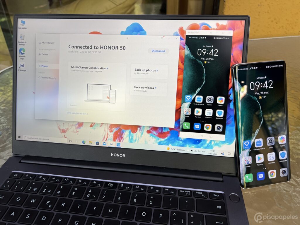 Lo bueno es que también podrás usar tu Honor 50 en tu computador Huawei o utilizar tu smartphone Huawei en un MagicBook de Honor, por lo que ambos sistemas — Huawei Share y Magic-link — son compatibles. Por ejemplo, yo tengo un Huawei MateBook X Pro y pude usar el Honor 50 con Huawei Share sin ningún problema, sólo lo acerqué a la etiqueta NFC y se sincronizó.