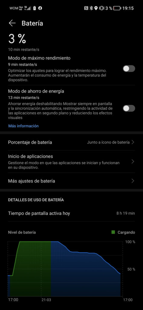 Con el uso personal que le di, teniendo el brillo en automático, conectividad 5G activada, conexión Wi-Fi de vez en cuando y con todos los ajustes aplicados a nivel de fábrica, el Honor 50 me brindó una autonomía de un poco más de 8 horas de pantalla.