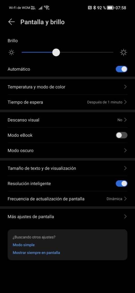 En cuanto a sus ajustes, podemos configurar la temperatura de la pantalla, activar el modo oscuro, modificar el tamaño del texto y de visualización, activar la función «Resolución inteligente”, elegir qué apps se visualizan a pantalla completa, agregar una muesca, activar el nombre del operador y mostrar la velocidad de la red.