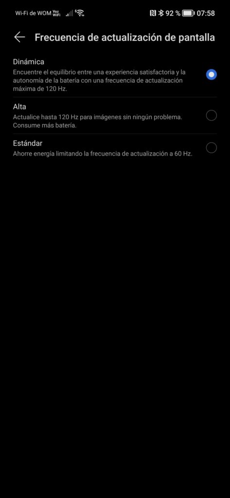Tenemos un refresco de 120Hz y la verdad es que en esta pantalla se nota, se puede apreciar la fluidez cuando te vas deslizando por su interfaz, y cuenta con tres opciones: “Dinámica”, “Alta”, y “Estándar”.