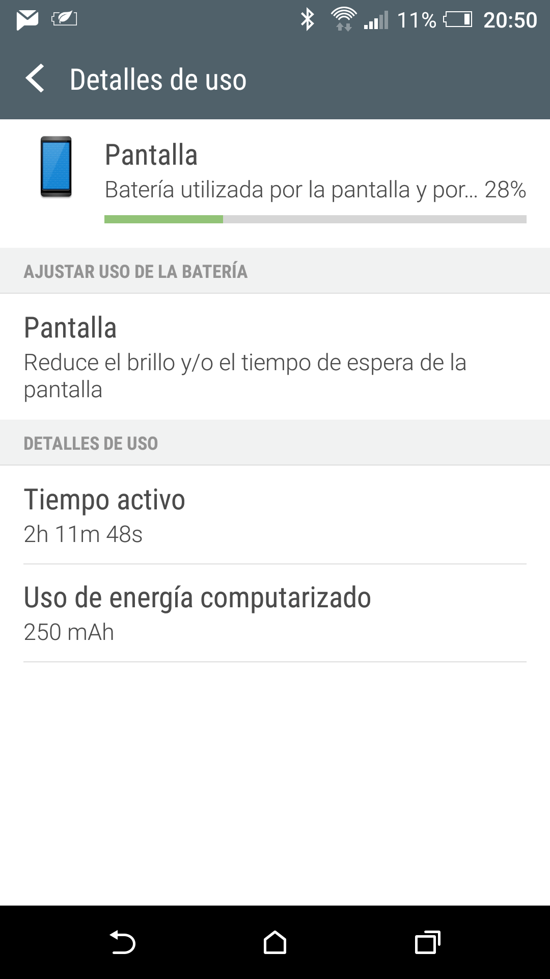 Duración de la prueba: Desde el miércoles a las 8:30 am hasta el miércoles a las 20:50, con un tiempo restante de 11% de batería.