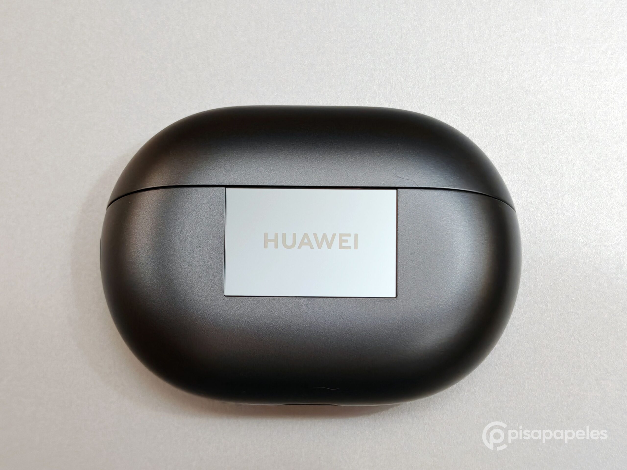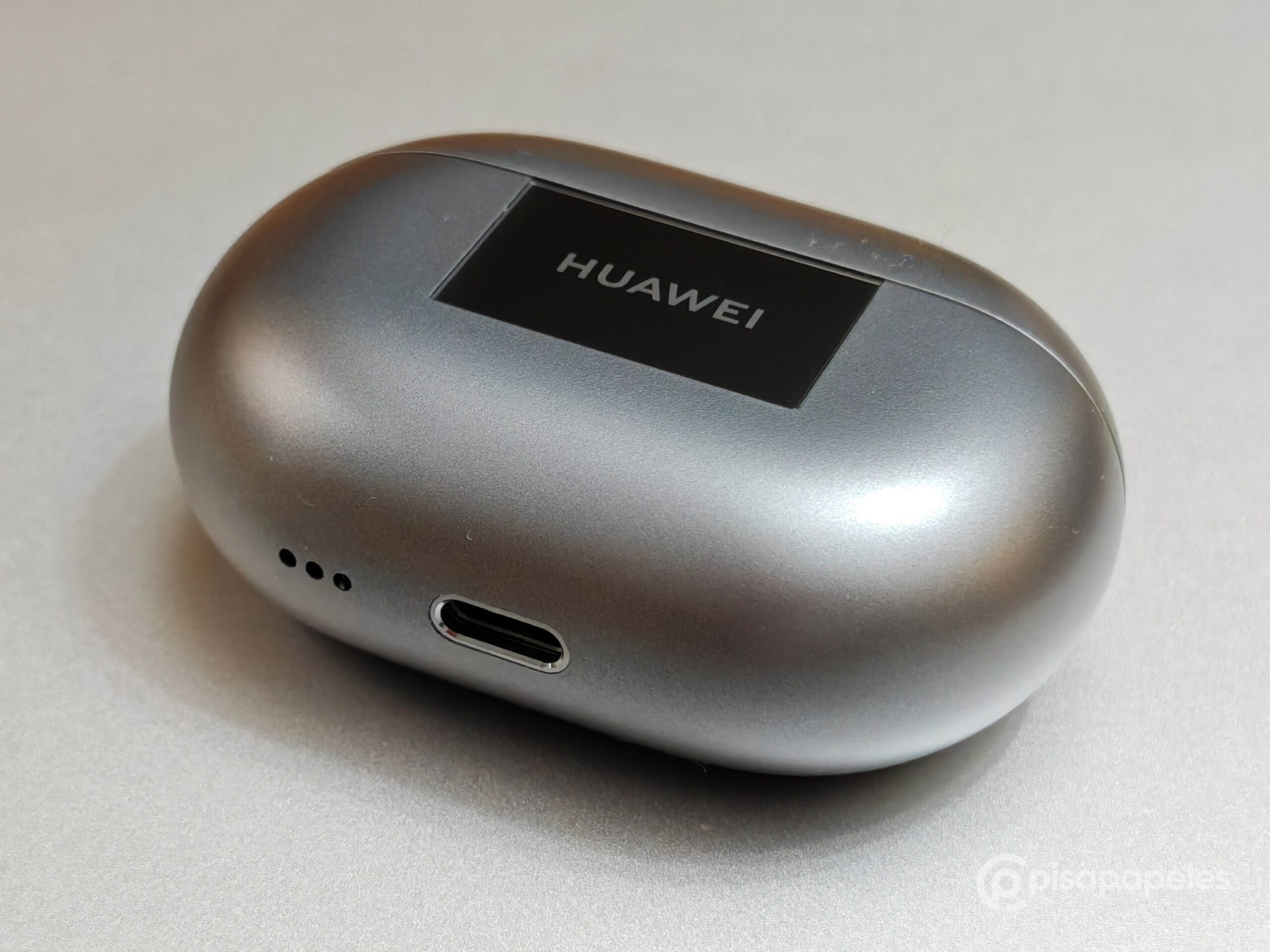 Por la parte trasera tenemos el logo de Huawei y esta es la zona por donde funciona su carga inalámbrica. Por la parte inferior tenemos su puerto USB-C y tres pequeños orificios, ahí está ubicado un pequeño altavoz que emite sonidos cuando el estuche inicia una carga o se activa el modo de sincronización.