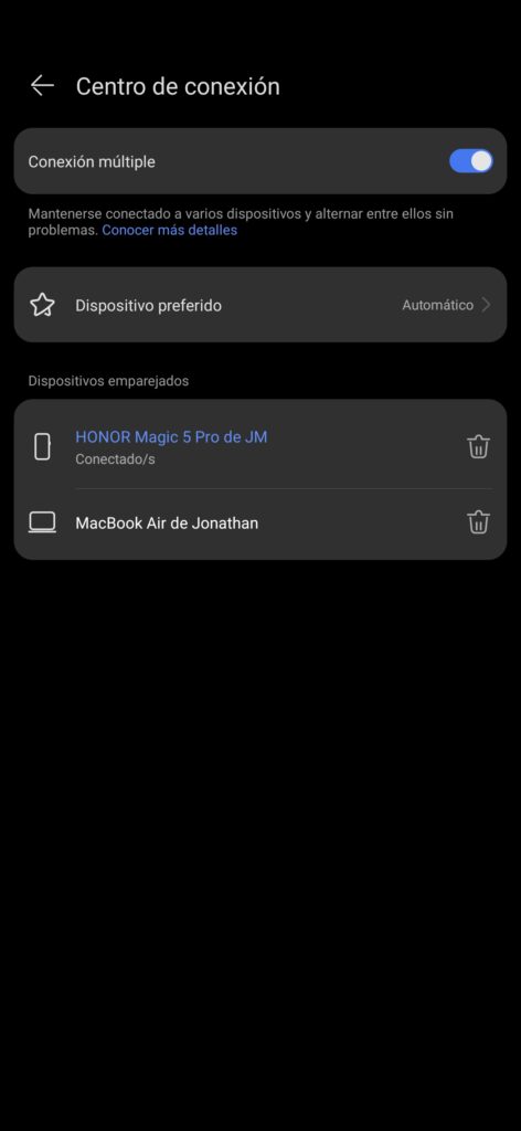 Luego tenemos la sección “Centro de conexión”, la que nos permitirá administrar los dispositivos que están sincronizados con nuestros audífonos, así como también podrás elegir de manera rápida qué dispositivos permanecerán conectados o desconectados. También te da la opción de elegir un dispositivo como “preferido” o que todo se realice de manera automática.