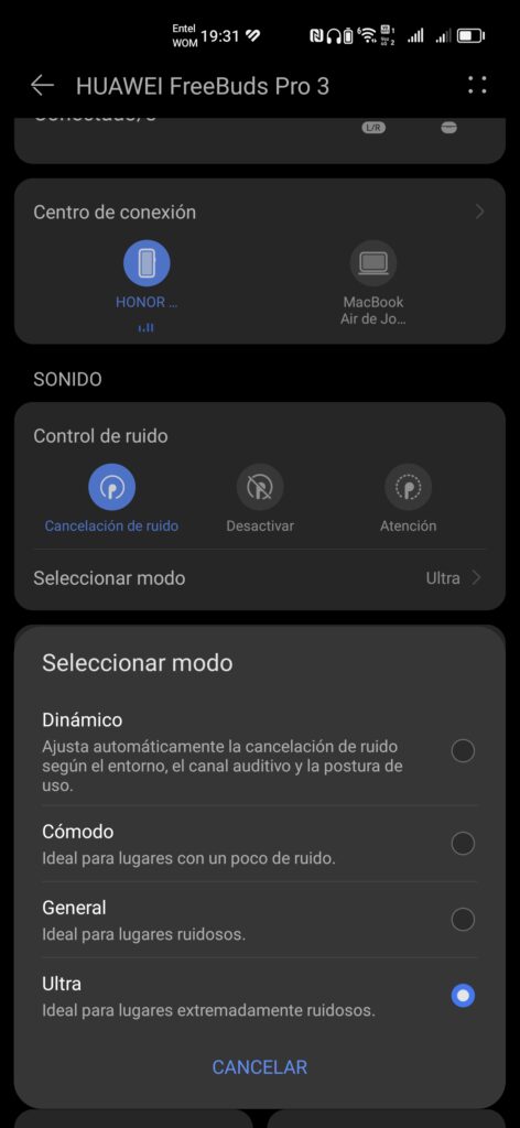 Luego tenemos el modo “Cancelación de ruido” en donde podemos elegir entre tres modos: