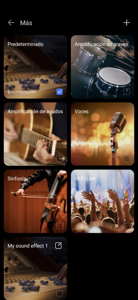 Pasamos a la sección “Efectos de sonido” en donde encontraremos 6 perfiles pre-ecualizados: Predeterminado, Amplificación de graves, Amplificación de agudos, Voces, Sinfonía, y Hi-Fi Live.
