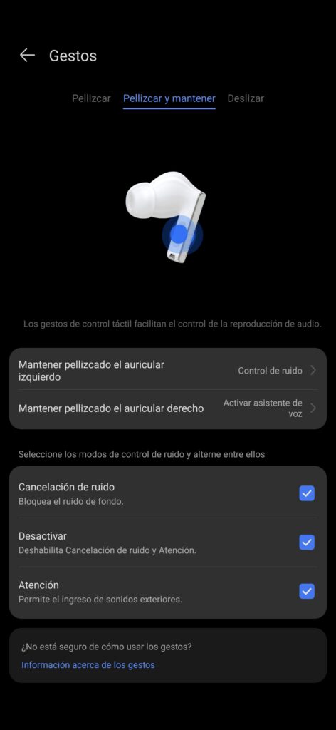 Continuamos con “Gestos”, lugar donde podemos cambiar la función que se aplicará cuando realicemos algún gesto en el sensor de la base rectangular de los audífonos.