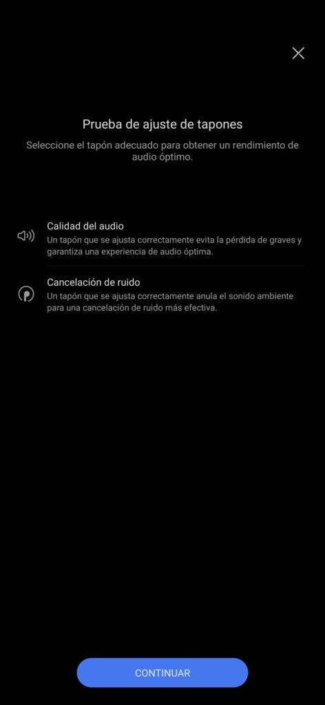 Por acá tenemos “Prueba de ajuste de tapones”, función que nos permitirá saber si llevamos los adaptadores correctos o no, y si los tenemos bien puestos en nuestros oídos. En caso contrario, nos irá dando consejos para solucionar el problema, ya que debe existir un buen sello para que la cancelación de ruido funcione de buena manera.