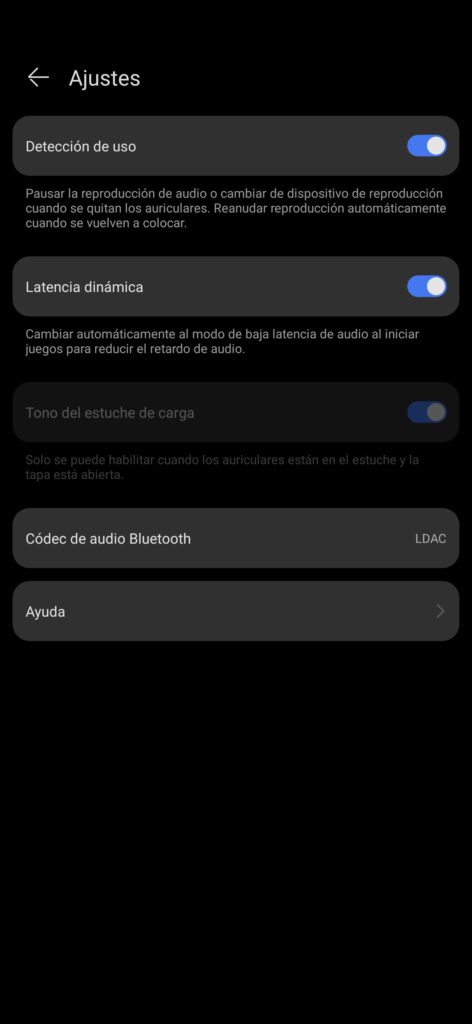 Ya para ir finalizando, tenemos el apartado “Ajustes” donde podemos activar la opción “Detección de uso”, el cual utiliza el sensor de proximidad de cada audífono para saber si están puestos en tus oídos y así pausar la reproducción cuando te los sacas o reanudarla cuando te los vuelves a poner.